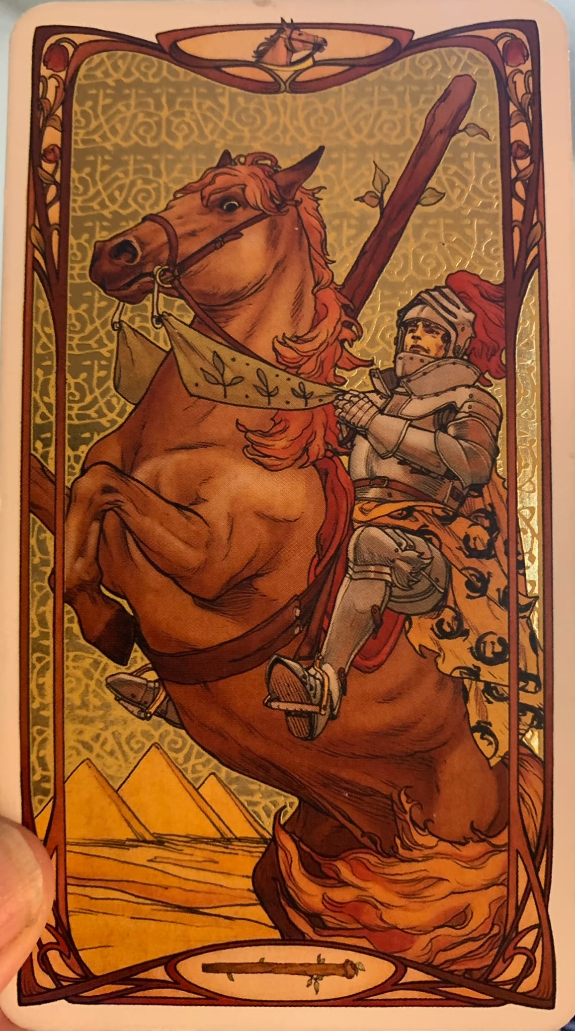 The Knight is a leader, too, the Knight shows the way. With their blazing wand they point us in the direction we must go to fulfill our passionate desires. That looks different for everyone. It is up to us to divine the path the Knight indicates. But it is vitally important to remember that the Knight of Wands is providing support and succor for us along the way, feeding our inner fire when our fuel gets low.